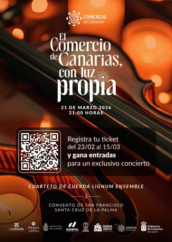 “Comercio de Canarias con luz propia” es una iniciativa de dinamización que busca fortalecer el tejido comercial de La Palma vinculando el consumo local con experiencias culturales exclusivas. Desde el 23 de febrero hasta el 15 de marzo ambos inclusive, registren sus tickets de compra para entrar en el sorteo de 100 invitaciones dobles para un concierto a la luz de las velas a celebrar en el Museo Insular de La Palma el sábado, 21 de marzo, a las 21:00.