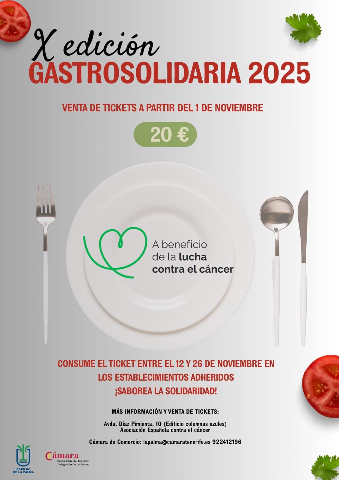 La Cámara Oficial de Comercio, Industria, Servicio y Navegación de Santa Cruz de Tenerife en La Palma abre las inscripciones para la décima edición de la Feria GastroSolidaria en la isla. Esta iniciativa, que cuenta con el apoyo del Cabildo insular, se celebrará del 12 al 26 de noviembre con el objetivo de recaudar fondos a favor de la Asociación Española Contra el Cáncer (AECC), organización que también participa como colaboradora.